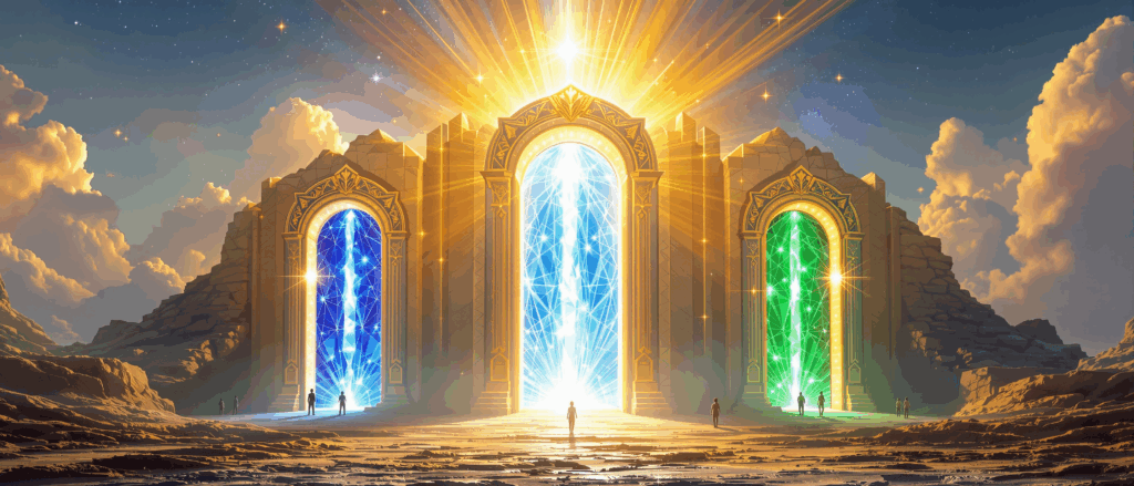 Když se všechny tři brány propojí, vzniká kruh jednoty. V jeho středu stojí přítomnost, pravda a důvěra – duchovní jádro budoucí civilizace. Přítomnost je vstupní brána, protože každá transformace se děje teď. Pravda je plamen, který očišťuje i oživuje. Důvěra je proud života, který plyne tam, kde už není potřeba řídit a kontrolovat.