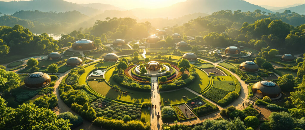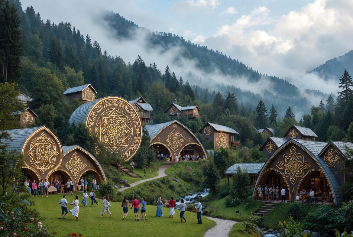 Architektura vesnic se inspiruje přírodními tvary: kruhem, květem života, posvátnou geometrií. Nejde jen o estetiku, ale i o funkci – prostředí, které podporuje harmonii mezi člověkem, přírodou a prostorem. Domy se staví z přírodních a udržitelných materiálů, energetické systémy využívají obnovitelné zdroje, voda a půda jsou chráněny jako posvátné zdroje života.