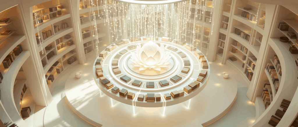 Srdcem knihovny je živá mapa vědomí, která ukazuje cestu od nevědomého života k plnému bytí. Je to systém, který pomáhá člověku vidět pravdu o sobě i o světě a vede ho k celistvosti. Obsahuje jednotlivé brány a klíče, které fungují jako transformační zrcadla – vždy odhalují, co je skutečné, a co je jen projekce ega.